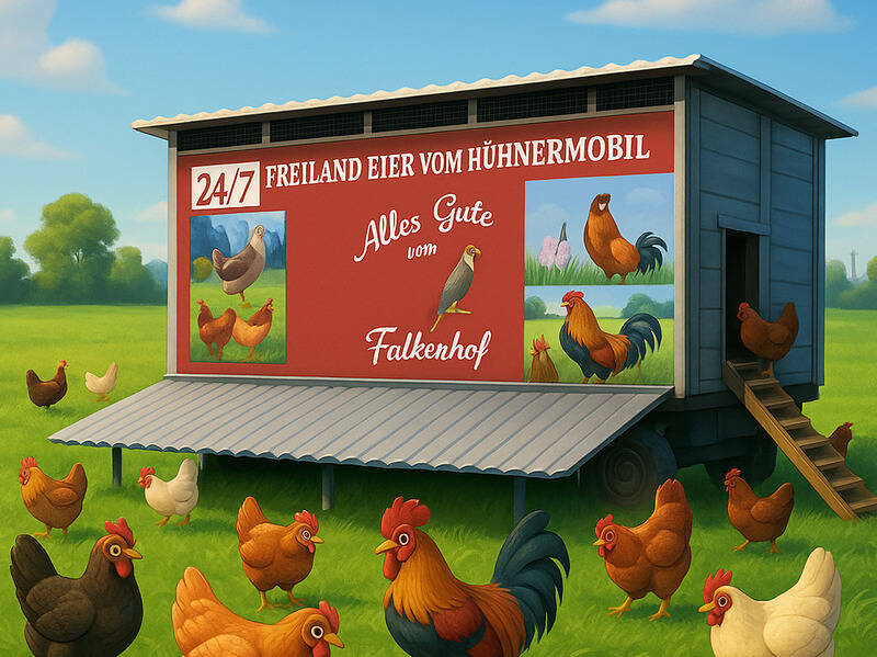 Was darf auf keinem Bauernhof fehlen??? Hühner!!! Unsere Hühner dürfen ganzjährig, frei um unseren Hof laufen. Um unseren Legehennen frisches Futter und die bestmögliche Haltung zu gewährleisten, ziehen sie mit ihrem Hühnermobil regelmäßig auf neues Weideland. Ihre beschützenden Ziegen sind natürlich auch immer dabei.