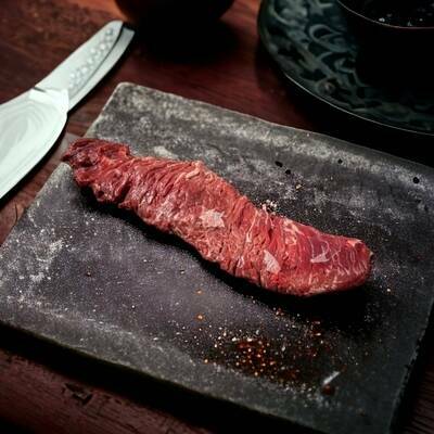 Das Skirt Steak wird aus dem Zwerchfell im Bereich zwischen Bauch und Brust geschnitten. Dieses starke Muskelfleisch ist fest in seiner Struktur, grobfaserig und durch die schöne Fettmarmorierung saftig und geschmacksintensiv.